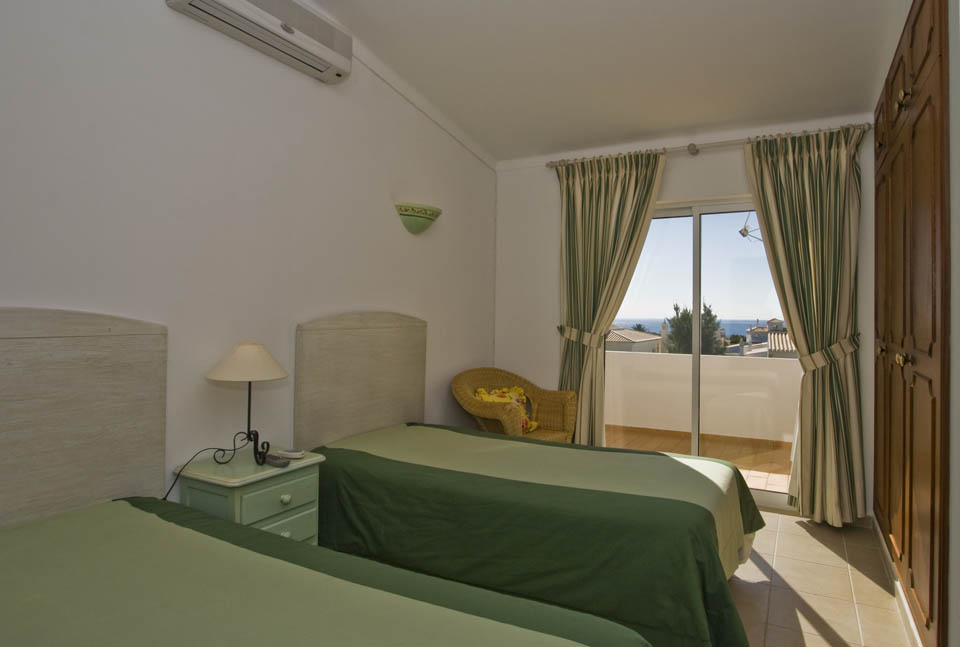 No 1º andar duas divisões sendo uma delas com uma porta para um terraço privado com vista mar. Há uma suíte master grande com cama king size, casa de banho com banheira de canto, e cabine de duche. Este quarto também tem uma porta para o terraço com vista para o jardim, piscina e mar. A outra divisão (escritório) tem duas camas individuais e um pequeno terraço privado com vista para a piscina e jardim. Tem também uma casa de banho com cabine de duche.