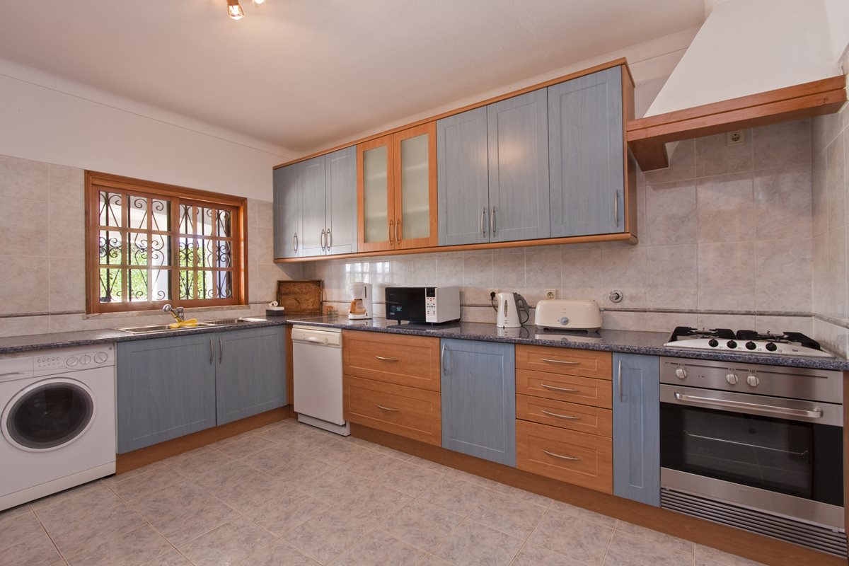 Cozinha totalmente equipada com electrodomésticos incluindo forno, placa, frigorifico, máquina de lavar loiça e máquina de lavar roupa e uma pequena arrecadação.